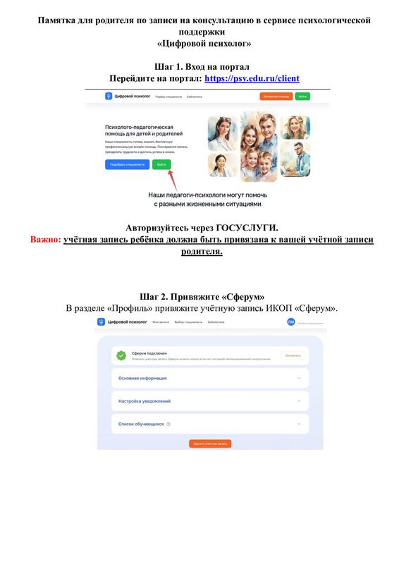 Темы для обсуждения: школьные проблемы и успеваемость, отношения со сверстниками, близкими людьми, самоопределение и выбор пути, вопросы воспитания и развития детей с ограниченными возможностями здоровья, инвалидностью, эмоциональное состояние, стрессовые ситуации и многое другое. Этот сервис станет важным инструментом поддержки эмоционального благополучия Вас и ваших детей. Проходите по ссылке для входа https://psy.edu.ru и записи к выбранному вами психологу.