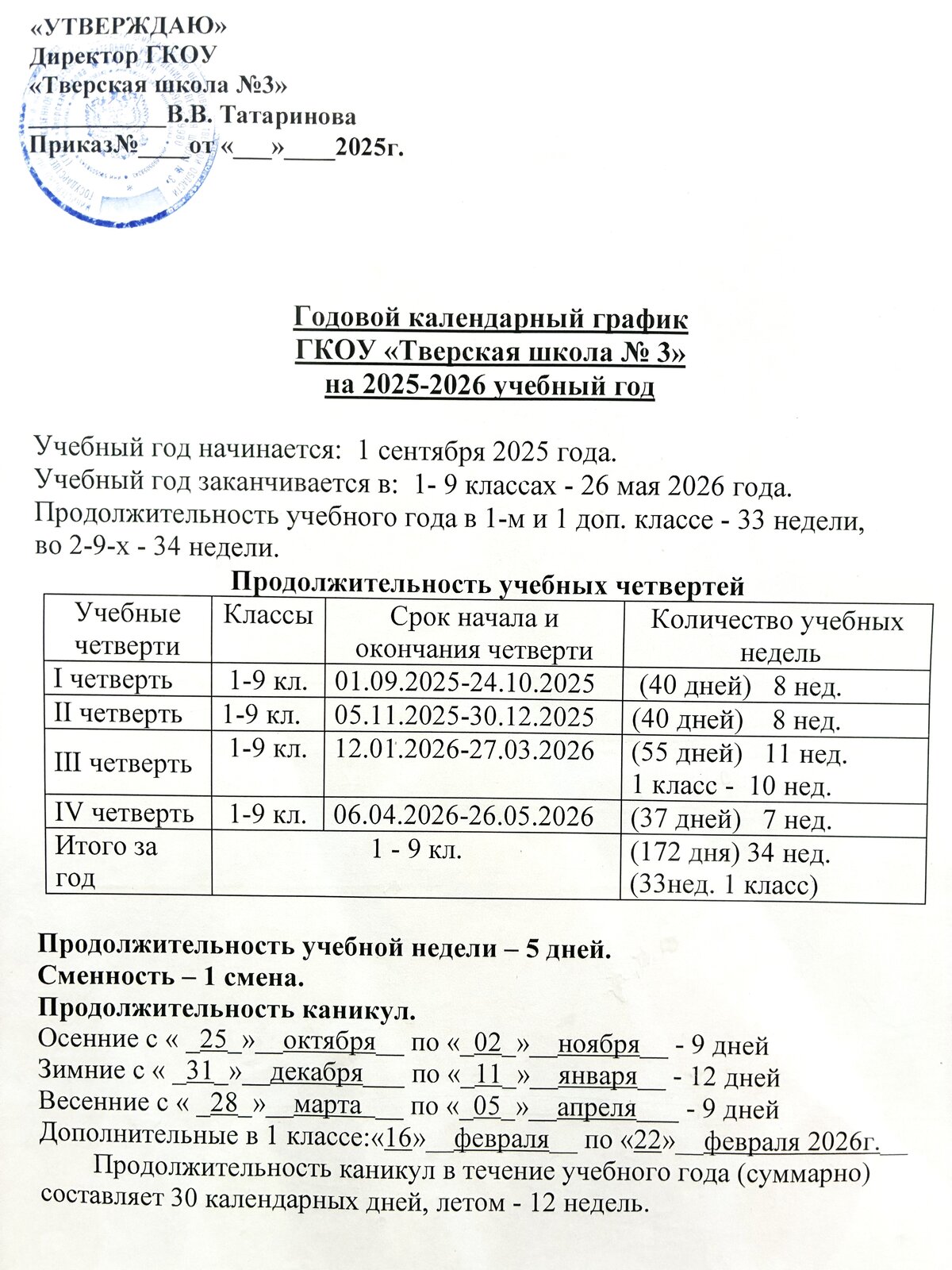 Продолжительность каникул в течение учебного года (суммарно) составляет 30 календарных дней, летом - 12 недель.